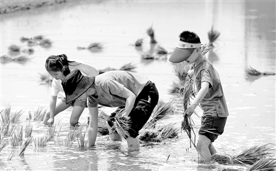 6月7日,孩子和家長(zhǎng)體驗(yàn)稻田插秧。當(dāng)日,在浙江省杭州市富陽區(qū)東洲街道紅旗村的勞動(dòng)教育實(shí)踐基地,數(shù)百名中小學(xué)生與家長(zhǎng)參加了趣味插秧和渾水摸魚等活動(dòng),體驗(yàn)農(nóng)事勞動(dòng)。新華社記者 徐昱 攝