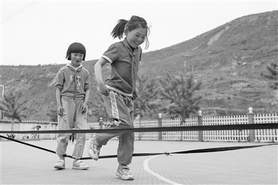 圖為甘肅省臨夏回族自治州東鄉(xiāng)族自治縣高山鄉(xiāng)布塄溝小學(xué)學(xué)生在嶄新的操場(chǎng)上進(jìn)行課間游戲。