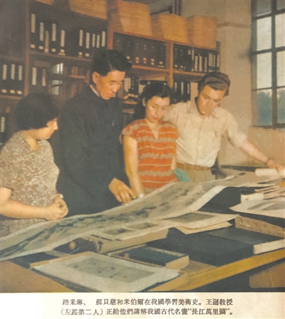 1954年7月,米伯爾就要畢業(yè)回國(guó)了,他笑稱自己是“滿載而歸”。這一年夏天,長(zhǎng)江流域正遭受著百年不遇的洪澇災(zāi)害,王遜先生取出南宋畫家夏圭的《長(zhǎng)江萬里圖》卷(影印本),為他上了最后一堂課。前來采訪的記者,用鏡頭拍下了這個(gè)瞬間,這張照片刊登在當(dāng)年的《人民畫報(bào)》上。
