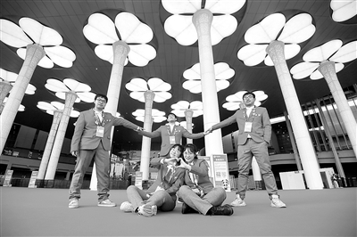 11月10日,來自上海工程技術(shù)大學(xué)的志愿者在國家會展中心(上海)南廣場入口處拍照留念。第三屆中國國際進口博覽會11月5日至10日在國家會展中心(上海)舉辦。在場館內(nèi)外,參展商、觀眾和工作人員紛紛拍照留影,記錄美好瞬間,留住難忘時光。新華社記者 陳曄華 攝