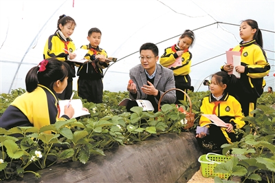 近日,山東省棗莊市市中區(qū)文化路小學結合校本教材《食育課程》內容,組織學生走進田間參加社會實踐活動,體驗農(nóng)耕文化,讓學生在寓教于樂的研學活動中掌握食育相關知識,從小養(yǎng)成勤儉節(jié)約和愛勞動的好習慣。圖為教師向學生講解草莓的營養(yǎng)價值。吉喆 王翔 攝