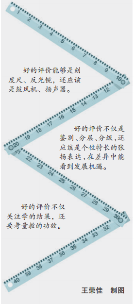 好的評價當(dāng)然能夠是刻度尺、反光鏡,還應(yīng)該是鼓風(fēng)機、揚聲器。不僅是鑒別、分層、分級,還應(yīng)該是個性特長的張揚表達,在差異中能看到發(fā)展機遇。不僅關(guān)注學(xué)的結(jié)果,還要考量教的功效。當(dāng)然更重要的是,學(xué)生和教師都應(yīng)該培養(yǎng)更積極的評價觀念。先要弄清楚,通過評價要得到什么。