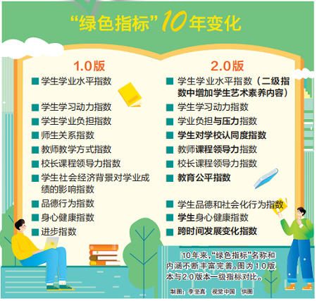 在“綠色指標(biāo)”2.0版中,10個(gè)一級(jí)指標(biāo)修訂為學(xué)生學(xué)業(yè)水平、學(xué)生身心健康、學(xué)生品德和社會(huì)化行為、學(xué)生學(xué)習(xí)動(dòng)力、學(xué)生對(duì)學(xué)校認(rèn)同度、學(xué)業(yè)負(fù)擔(dān)與壓力、教師課程領(lǐng)導(dǎo)力、校長(zhǎng)課程領(lǐng)導(dǎo)力、教育公平、跨時(shí)間發(fā)展變化。