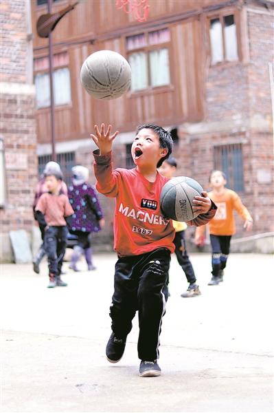 近日,在湖南省懷化市通道侗族自治縣獨(dú)坡鎮(zhèn)駱團(tuán)村,一名小學(xué)生在村部樓前練習(xí)籃球投籃動(dòng)作?!半p減”政策實(shí)施以來,該縣各學(xué)校按照學(xué)生興趣引導(dǎo)學(xué)生參加籃球、足球等10余項(xiàng)體育“第二課堂”活動(dòng),增強(qiáng)學(xué)生體質(zhì)。李尚引 攝