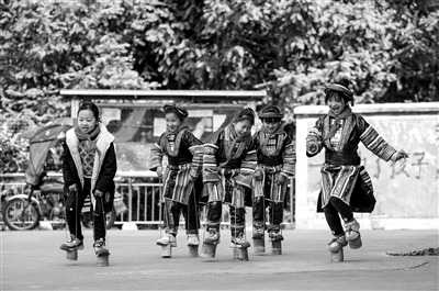 日前,貴州省黔東南苗族侗族自治州從江縣西山鎮(zhèn)中寨教學(xué)點(diǎn)學(xué)生在課外活動(dòng)中比賽踩高蹺。位于大山深處的西山鎮(zhèn)中寨教學(xué)點(diǎn),是一所目前僅有1名教師和16名學(xué)生的“微小學(xué)”,全校學(xué)生均為瑤族。近年來,隨著教學(xué)條件逐漸改善,昔日破舊的教學(xué)樓、土操場(chǎng),變成了三層教學(xué)樓、水泥籃球場(chǎng)。此外,學(xué)校還新修了演出舞臺(tái),學(xué)生有了免費(fèi)午餐,教師以校為家,村民尊師重教,同時(shí)得到社會(huì)各界愛心人士的鼎力資助,這所深山瑤寨“微小學(xué)”正在發(fā)生翻天覆地的變化。