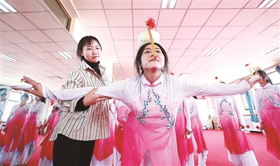 近日,甘肅省張掖市民樂(lè)縣職業(yè)教育中心學(xué)校教師在指導(dǎo)學(xué)前教育專業(yè)學(xué)生練習(xí)“非遺”頂碗舞。學(xué)校建成“非遺”傳承基地、民間藝人工作室,定期給學(xué)生授課,有效提升了學(xué)生的人文素養(yǎng)。本報(bào)記者 張學(xué)軍 鄭芃生 攝