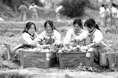 日前,在貴州省黔東南苗族侗族自治州岑鞏縣龍?zhí)镦?zhèn)中心小學(xué),學(xué)生在勞動(dòng)教育基地整理剛采收的蘿卜。