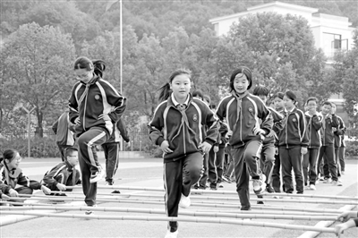浙江德清莫干山鎮(zhèn)中心學(xué)校的學(xué)生們在大課間時跳竹竿舞。 資料圖片