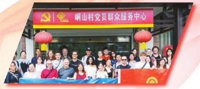 參加珞珈國際夏令營的外國高校師生與武大馬院志愿者參訪湖北鄂州峒山村黨員群眾服務(wù)中心。學(xué)校供圖