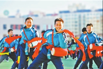 ?榆林高新二中學(xué)生在練習(xí)腰鼓。陜西省教育廳供圖
