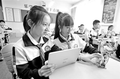 近日,山東省青島市市北區(qū)平安路第二小學(xué)開展“校園科技之光”主題活動(dòng),學(xué)生用平板電腦編寫程序操控機(jī)器人。王海濱 攝
