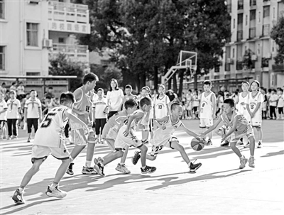 貴州省黔東南苗族侗族自治州凱里市第四小學(xué)學(xué)生在進行籃球比賽。 蔡興文 攝