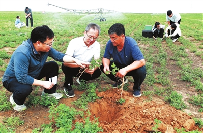 在陜西省榆林市定邊縣鹽場(chǎng)堡鎮(zhèn)賈圈村沙化鹽堿化綜合治理技術(shù)示范基地,西北農(nóng)林科技大學(xué)魏孝榮研究員(前中)與團(tuán)隊(duì)骨干李偉副研究員(前左)和定邊縣宏勃農(nóng)業(yè)發(fā)展有限公司負(fù)責(zé)人陳學(xué)軍(前右)一起查看苜蓿根系生長(zhǎng)情況。