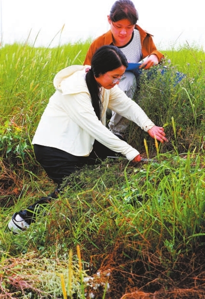 魏孝榮研究員團(tuán)隊(duì)博士研究生劉立玲(前)與碩士研究生劉洪洋(后)在沙地上測(cè)量牧草生長(zhǎng)指標(biāo)。