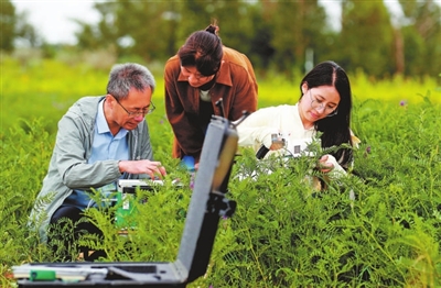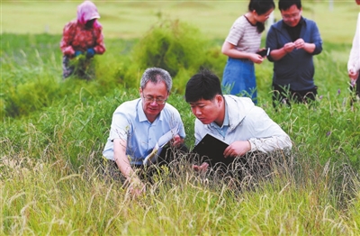 在定邊縣生態(tài)氣象聯(lián)合實(shí)驗(yàn)室野外科研基地,魏孝榮研究員(前左)與團(tuán)隊(duì)骨干鐘澤坤副研究員(前右)調(diào)查牧草生長(zhǎng)情況。