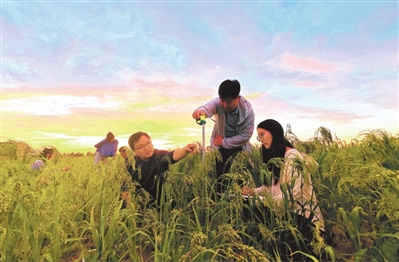 日前,陜西省榆林市定邊縣鹽場(chǎng)堡鎮(zhèn)東灘村的一大片沙地里,及膝高的糜子已經(jīng)被長(zhǎng)串穗條壓彎了腰,清風(fēng)徐來(lái),碧海蕩漾。西北農(nóng)林科技大學(xué)副研究員李偉帶領(lǐng)師生和定邊縣宏勃農(nóng)業(yè)發(fā)展有限公司負(fù)責(zé)人陳學(xué)軍,走進(jìn)這片綠色的海洋里,低頭查看。