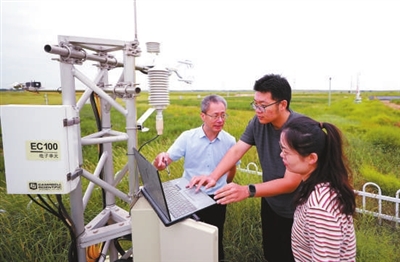 在定邊縣生態(tài)氣象聯(lián)合實(shí)驗(yàn)室野外科研基地,魏孝榮研究員(左)與團(tuán)隊(duì)博士研究生張景舜(中)、定邊縣氣象局工作人員安可(右)一起現(xiàn)場(chǎng)查看生態(tài)系統(tǒng)水碳通量監(jiān)測(cè)數(shù)據(jù)。