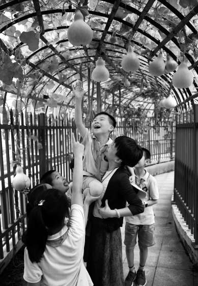 浙江省杭州市濮家小學(xué)學(xué)生在樓頂農(nóng)場(chǎng)采摘。 學(xué)校供圖