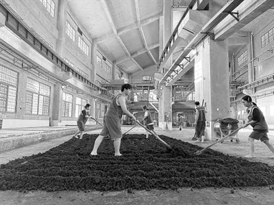 ④學(xué)生翻拌攤晾酒糟。 學(xué)校供圖