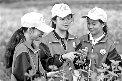 沭陽縣懷文小學學生在公園中觀察植物的生長情況,記錄植物的發(fā)芽、開花等過程。胡威 攝