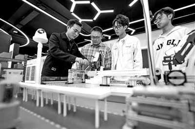 10月29日,鄭棋元(左一)在云南技師學(xué)院利用沙盤模型與學(xué)生探討研發(fā)項(xiàng)目。