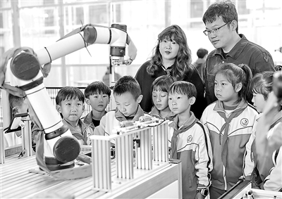 近日,河北省秦皇島市海港區(qū)交建里小學(xué)聯(lián)合燕山大學(xué)工程訓(xùn)練中心舉辦“學(xué)習(xí)科普知識(shí) 感受智能制造”活動(dòng),讓學(xué)生感受智能制造的魅力和科技發(fā)展成就,培養(yǎng)學(xué)生的科學(xué)精神。圖為工作人員為學(xué)生介紹智能化打標(biāo)檢測(cè)與裝配系統(tǒng)。 曹建雄 攝