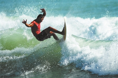 在沖浪男子短板決賽中,18歲的海南隊選手吳世棟戰(zhàn)勝對手奪冠。
