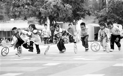 孩子們?cè)谶M(jìn)行滾鐵環(huán)比賽。