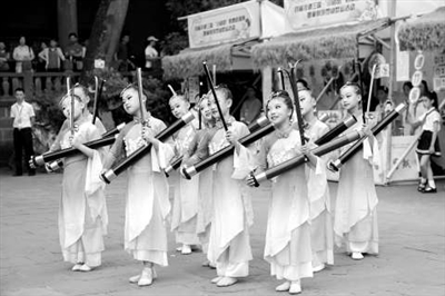 成都市龍江路小學(xué)分校竹琴社團(tuán)的同學(xué)們在武侯祠表演。學(xué)校供圖