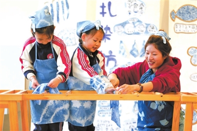 11月19日,四川省樂(lè)山市實(shí)驗(yàn)幼兒園至樂(lè)分園教師在指導(dǎo)孩子們晾曬自己的扎染作品。世界兒童日(11月20日)來(lái)臨之際,該幼兒園開(kāi)展“樂(lè)學(xué)扎染 感受非遺”活動(dòng),教師指導(dǎo)孩子們體驗(yàn)扎染制作技藝,感受中華優(yōu)秀傳統(tǒng)文化的魅力。