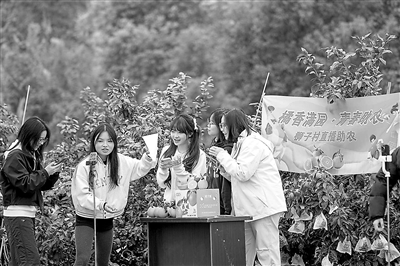 在四川眉山天府新區(qū)青龍街道獅子村,四川大學(xué)錦江學(xué)院的學(xué)生正在通過直播推銷柑橘。翁光建 攝