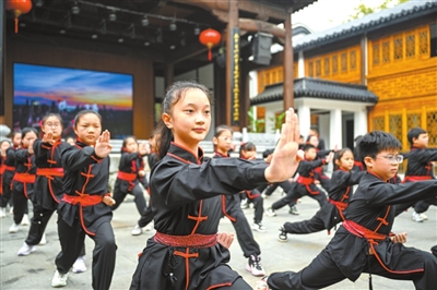 近日,安徽省合肥市廬陽(yáng)區(qū)雙崗街道虹橋小學(xué)學(xué)生正在進(jìn)行傳統(tǒng)武術(shù)操展演。趙明 攝