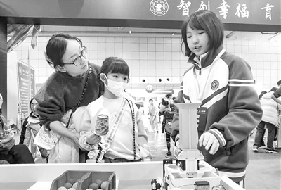 北京交通大學(xué)附中學(xué)生給前來參觀的學(xué)生及家長講解“智慧機(jī)械顆粒歸倉”機(jī)器人科創(chuàng)項(xiàng)目。本報(bào)記者 單藝偉 攝