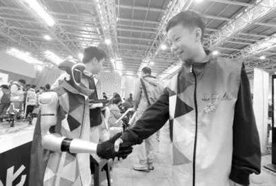 北京市建華實(shí)驗(yàn)學(xué)校六年級學(xué)生在同“華啟明”人形機(jī)器人進(jìn)行握手互動展示。本報(bào)記者 單藝偉 攝