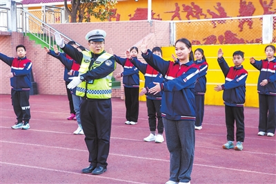 11月28日,湖北省襄陽市諸葛亮中學(xué),民警正在教學(xué)生們交通安全手勢(shì)。 李旭暉 攝