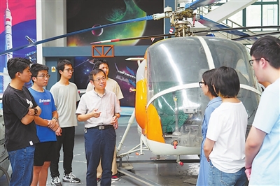 課程組教師在航空航天館內(nèi)的直升機(jī)(由南航師生研制的我國(guó)第一架自主設(shè)計(jì)制造的直升機(jī)“延安二號(hào)”)旁授課。資料圖片
