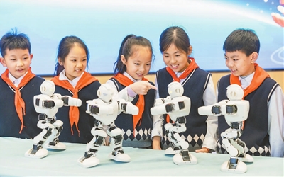 近日,江蘇省海安高新區(qū)實(shí)驗(yàn)小學(xué)的學(xué)生在校園科技節(jié)上觀看智能機(jī)器人表演。連日來(lái),該校舉辦“科技潤(rùn)童心 創(chuàng)新筑夢(mèng)想”校園科技節(jié),學(xué)生通過(guò)視覺(jué)體驗(yàn)、科技創(chuàng)想等形式,感受科技魅力。翟偉凱 攝