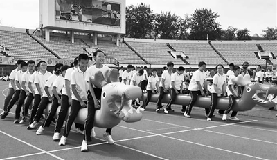 圖① 學(xué)生進(jìn)行趣味集體比賽——龍行萬里。