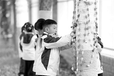 12月23日,江西省上饒市余干縣實驗幼兒園的小朋友們用毛衣與零散毛線,認(rèn)真地為大樹“穿衣”。韓海建 攝