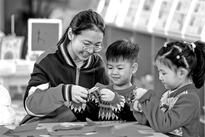 近日,在山東省青島市李滄區(qū)青山路幼兒園,老師指導(dǎo)小朋友學(xué)習(xí)剪紙。張鷹 攝