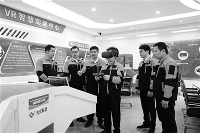 廣西現(xiàn)代職院智能制造技術(shù)教學(xué)團(tuán)隊(duì)在VR智慧實(shí)訓(xùn)中心現(xiàn)場(chǎng)教學(xué)。學(xué)校供圖