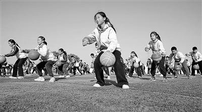江蘇省海安市李堡鎮(zhèn)曹園小學(xué)的學(xué)生在大課間進(jìn)行籃球運(yùn)動(dòng)。 周強(qiáng) 攝