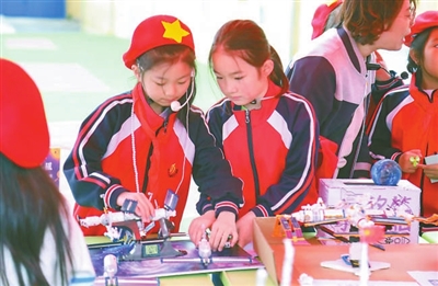 黑龍江省哈爾濱市繼紅小學(xué)科技大集上,學(xué)生協(xié)作調(diào)試航天模型作品。學(xué)校供圖
