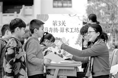 在位于福建省福州市臺江區(qū)的福州四中光明校區(qū)(小學(xué)部),學(xué)生正在“小馬奔騰·神算工坊”游園環(huán)節(jié)體驗(yàn)數(shù)學(xué)樂趣。 通訊員 謝貴明 攝