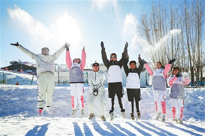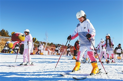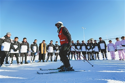 內(nèi)蒙古自治區(qū)鄂爾多斯市,九城宮國際滑雪場,冬日的陽光斜照雪道,泛著細碎的銀光。“減速時,雪板呈‘內(nèi)八’,腳尖向內(nèi),膝蓋下壓……”學生們低聲重復(fù)動作要領(lǐng),試探挪動腳下的雪板,在教練的引導(dǎo)下開始緩緩向前滑行。