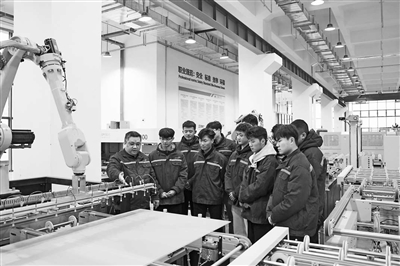 山東理工職院教師指導(dǎo)學(xué)生光伏組件生產(chǎn)實(shí)習(xí)。 學(xué)校供圖