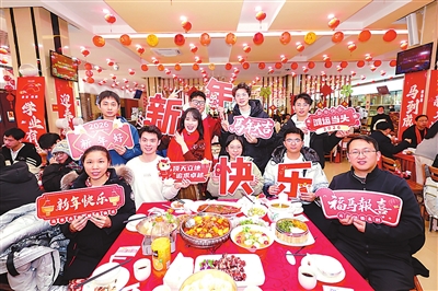 2月11日,華中科技大學(xué)組織師生吃新春團年飯。迎春會、寫春聯(lián)、包餃子……新春將至,多所高校為寒假留校師生組織精彩活動,準備豐盛的團年飯,送上誠摯祝福。新華社發(fā)